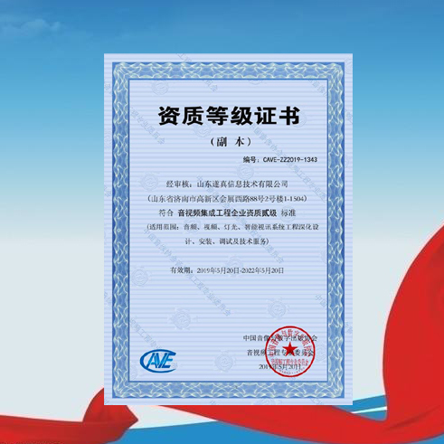 公司獲得中國音像協(xié)會音視頻工程專業(yè)委員會頒發(fā)的《音視頻集成工程企業(yè)資質貳級》證書,成為省內首批通過該權威機構認證的二級資質企業(yè)。